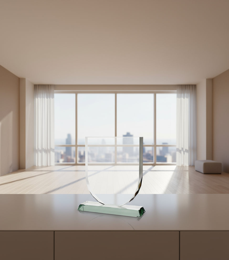 Jemne leštené skosené hrany podčiarkujú tvar štítu, zatiaľ čo masívna ručne brúsená podstava dodáva trofeji stabilitu a noblesu.